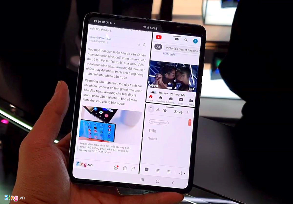Mọi việc khác hẳn khi mở màn hình ra. Màn hình Super AMOLED với kích thước 7,1 inch của Fold rất rộng, giúp hiển thị nội dung lớn, rõ. Phần lớn ứng dụng đều đem lại trải nghiệm đã hơn khi màn hình mở ra, từ bản đồ, YouTube tới đọc báo.